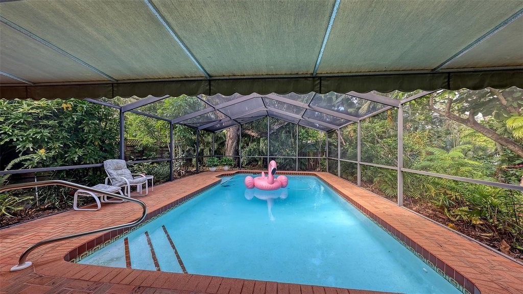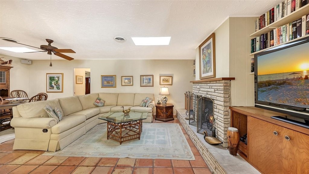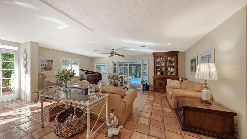 Don't miss this opportunity to own a "West of the Trail" home in one of Sarasota's most sought-after neighborhoods on a tree-lined quiet street. This three-bedroom residence features a desirable split-bedroom floor plan and a spacious living room that opens to a screened, caged swimming pool surrounded by brick pavers--perfect for indoor/outdoor living. The home also offers a comfortable family room with a wood-burning fireplace, a separate dining room with access to a paved backyard patio, and a breakfast bar that connects to the gally-style kitchen. Abundant storage and closet space galore can be found throughout, including built-in cabinetry in the primary bedroom and family room. Roof and water heater were replaced in 2016, pool pump/filter and pool sweep replaced in 2024. The home's excellent curb appeal is highlighted by mature oak trees, lush tropical vegetation, blooming azaleas, and a circular driveway plus a two-car garage which provides additional storage. This inviting property offers both charm and functionality - an ideal place to call home.
